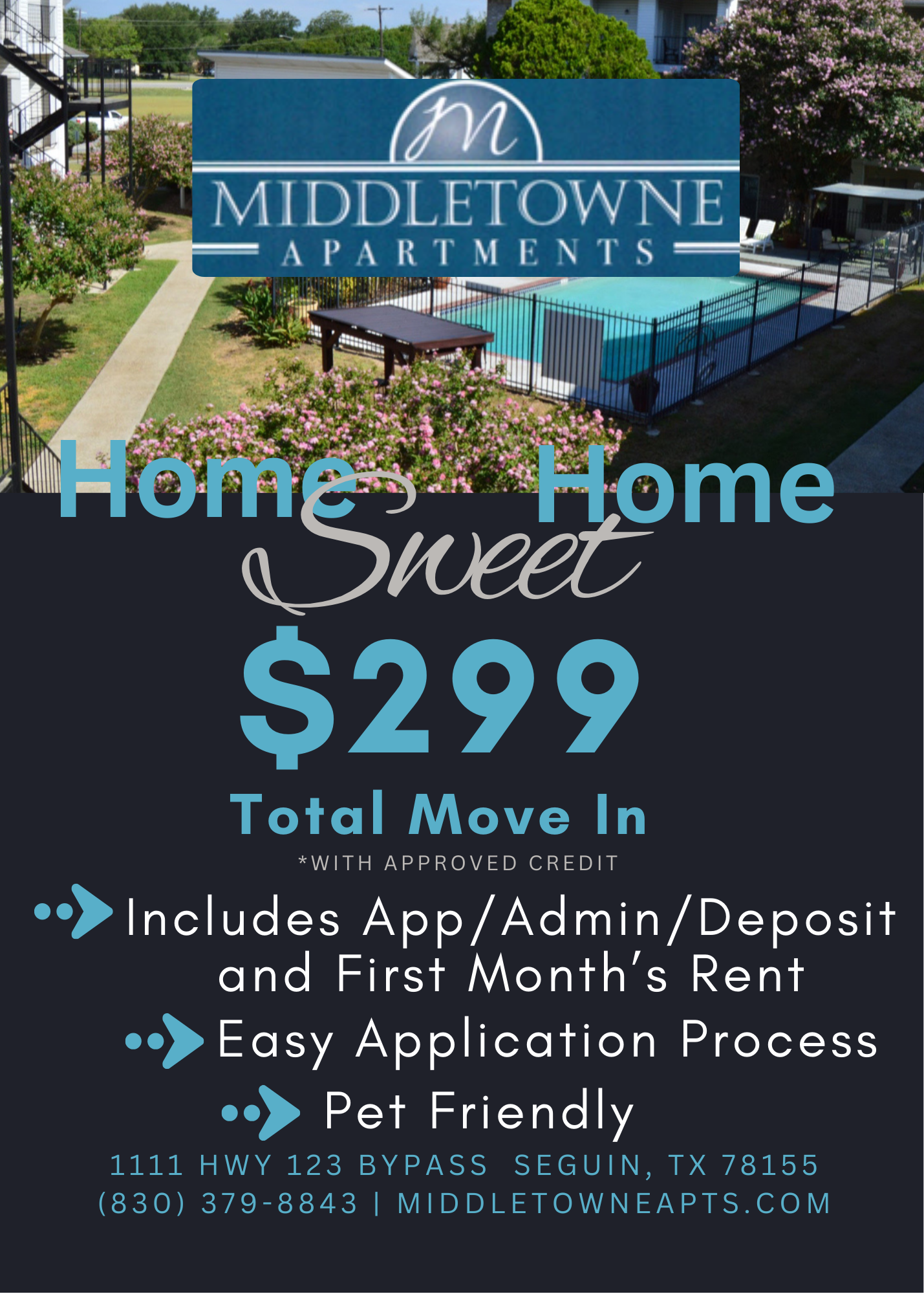 Middletowne Apartments is in a prime location in Seguin, Texas, making it an ideal place to call home. Our community is conveniently located near local attractions, including shopping centers, restaurants, and outdoor recreational facilities. With easy access to downtown Seguin, you'll have everything you need at your fingertips. Check out our neighborhood page to discover the fantastic venues surrounding our charming community!